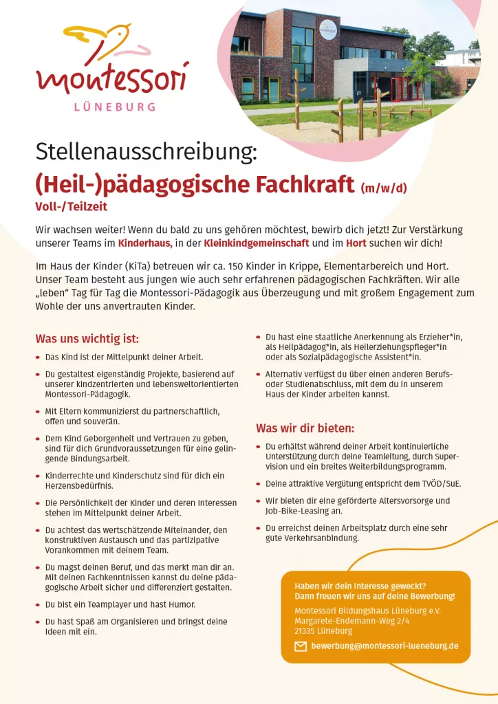 Wir brauchen dich – (Heil-) pädagogische Fachkraft für unsere Teams im Kinderhaus, in der Kleinkindgemeinschaft und im Hort gesucht.