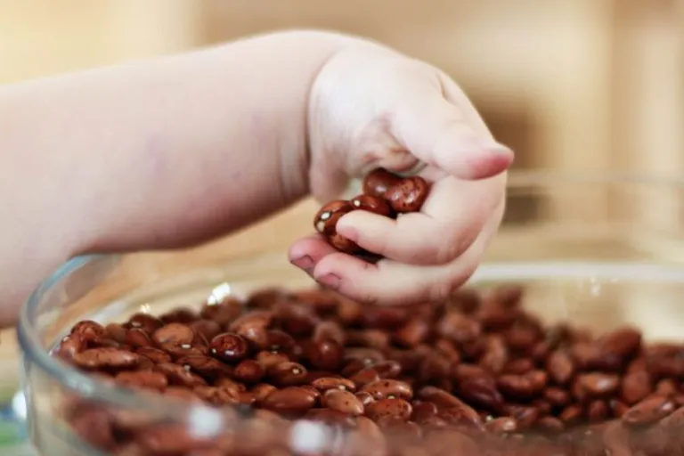 In der Kinderküche gibt es bis 9.15 Uhr Frühstück, um 10.15 Uhr eine kleine Knusperpause und von 11.45 Uhr bis 13.00 Uhr das gleitende Mittagessen. Am Nachmittag findet um 14.30 Uhr eine Obstpause statt. Das Obst wird von einigen Kindern nach dem Mittagessen geschnitten und angerichtet. Angegliedert an die Kinderküche, können die Kinder im Naschgarten selber pflanzen, ernten und gemeinsam verwerten. Außerdem können in der Kinderküche die Übungen des praktischen Lebens getätigt werden. Die pädagogische Fachkraft lädt ein Kind ein, aus einem Kochbuch ein Rezept für den Backtag am Freitag auszuwählen. Das Kind entscheidet sich für Schmetterlings- Brötchen. Die Kinder waschen ihr Geschirr ab, bügeln Tischdecken, mahlen Hafer für das Frühstück und holen Essen aus der Küche nach.