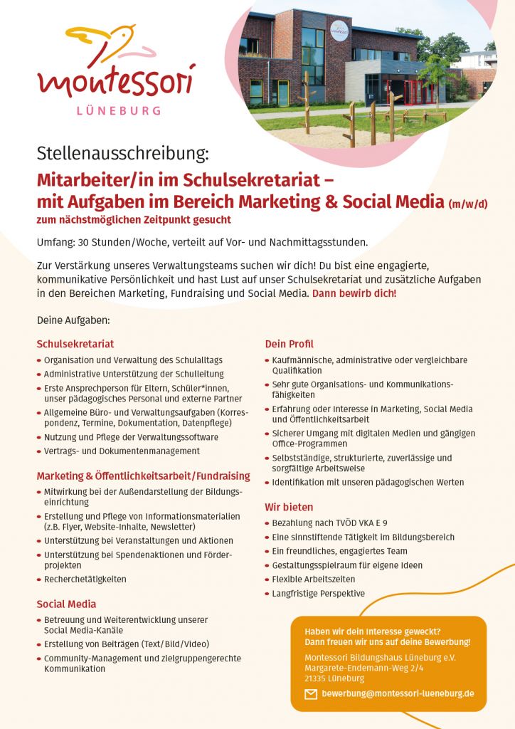 Wir brauchen dich – Mitarbeiter/in im Schulsekretariat gesucht – mit Aufgaben im Bereich Marketing und Social Media.